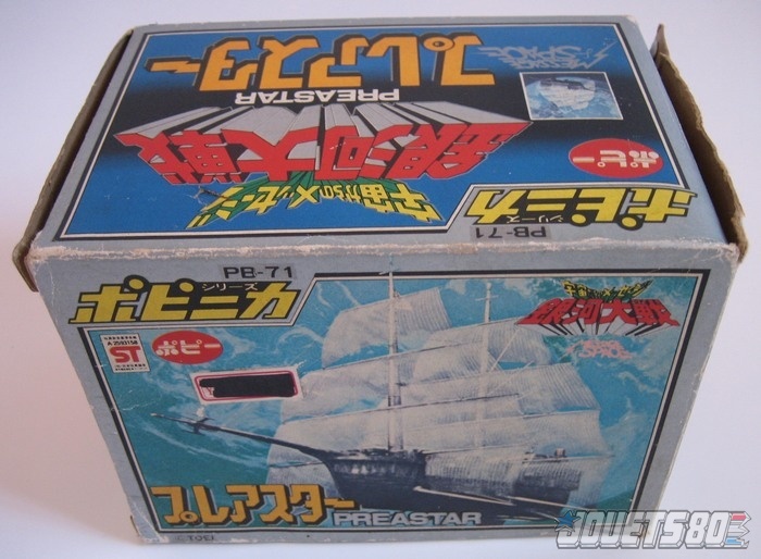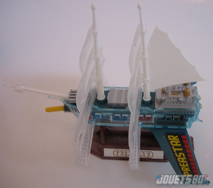 Parmi les 6 véhicules de la gamme San Ku Kai, seul l'Azuris (Ndlr: Preastar en version japonaise) n'a pas été commercialisé sur le sol français. Dans la série, le vaisseau d'Eolia est pourtant d'un grand secours pour nos héros, mais plusieurs facteurs ont surement joué contre sa distribution dans nos contrées. Tout d'abord, il représente le vaisseau d'un personnage féminin, connotation assez négative quand on le replace dans le contexte du jouet pour garçons. Ensuite, les dimensions du véhicule sont assez modests (environ 10 cm de long et pas moins de haut), voir ridicules placé à côté des autres jouets de la gamme. Enfin, la jouabilité est limitée, le stand livré avec fait vraiment penser à un objet statique à vocation d'exposition. Néanmoins, pour un collectionneur, le vaisseau de la belle et emblématique Eolia est une pièce à posséder ! Origine: Japon