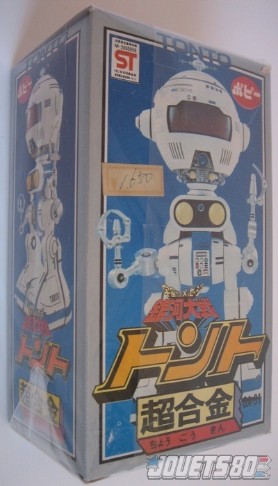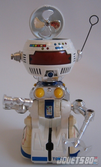 On continue dans la série San Ku Kai avec Sidéro (Ndlr: Tonto en japonais et Qonto en version US) le robot qui compagnon les 3 compères Ryû, Ayato et Siman. D'une quinzaine de centimètres, il est une assez fidèle reproduction. Monté sur roulettes, un mécanisme active ses jambes lorqu'on le fait avancer. De plus, une trappe située au-dessus de la tête nous fait découvrir le ventilateur qui lui refroidit les circuits. Au niveau des accessoires, on trouve tout d'abord 3 pairs de mains interchangeables qui représentent une pince, un laser et un marteau. Le sachet compte également 6 missiles que l'on peut placer 2 par 2 sur le torse du robot. A noter que seule la version japonaise possède ce mécanisme d'éjection des missiles, les autres continents ayant une version avec missiles intégrés au buste et non déplaçable. Origine: Japon (Cliquez sur les miniatures pour afficher l'image)