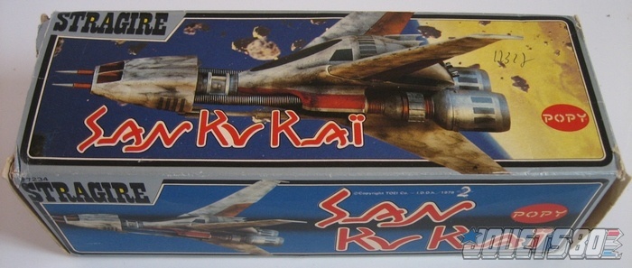 Voici l’un des deux vaisseaux de combat rapproché que l’on retrouve sur les flancs du San Ku Kai. Appelé Galaxy Runner dans sa VO (Ndlr : on retrouve d’ailleurs le nom sur les stickers qui n’ont pas été modifiés), il est pour moi le jouet le plus réussi de la gamme. On retrouve pléthore de fonctionnalités : le nez du vaisseau s’éjecte, les trains d’atterrissage et les ailes se déploient. Pour plus de réalisme, le cockpit peut s’ouvrir afin d’y placer la figurine articulée d’environ 5 cm. La puissance de tir se localise à l’avant de chacun des réacteurs où l’on peut placer l’un des 6 missiles fournis avec le chasseur. Le boîtage présente le logo A2, signe distinctif de la version française. Il existe 2 types d’inserts, une version cartonnée et une version polystyrène (Ndlr : concerne le Jetiscope et le stragire, version française et italienne). Origine: France